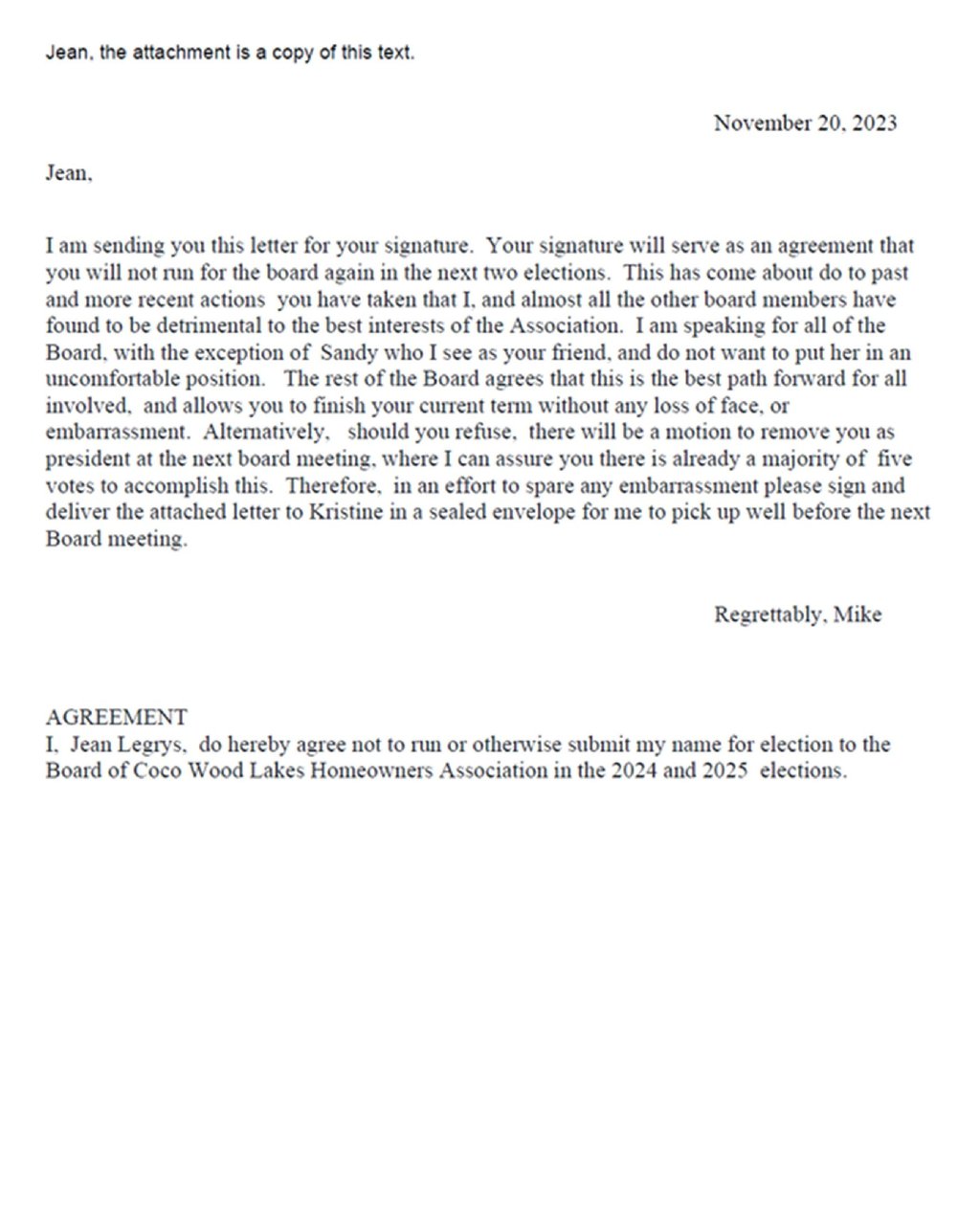 That resulted in an email to Jean on November 20, 2023, in which she was asked to leave quietly. But she refused to step down. So she was voted off the board during the following board meeting. But Jean still showed defiance. Below is that email.