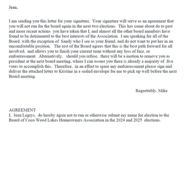 By the end of 2023, things finally caught up with Jean and her shenanigans on the board. The 'last straw' was when she tried to prove her point during a dispute with the other board members and took it upon herself and unbeknownst to them, to get the opinion of the association lawyer. The lawyer's written opinion proved Jean to be wrong. That also resulted in a charge of $450.00, which another board member accidentally stumbled upon when the invoice arrived.