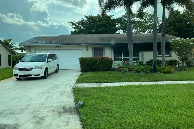 When another one of her friends, Sandy Steinberg, had a shredded tarp falling off her roof and draped over all sides of her home for more than four months during 2023, Marianne and the rest of the board were fully aware of the situation, but again failed to address the situation, impose a violation, or take any enforcement action on her friend (and fellow board member at that time) to correct the issue. Additionally, several plants were growing from the gutters, the front gutter was falling off the house, and the tarp dropped down over the front so that it covered the front door and windows. Yet all the while Marianne was enforcing violations on others. Below are two of many photos taken of Sandy Steinberg's house showing the condition that lingered needlessly for more than four months. Please note that the roof tarp is also covering more than half the front windows. The house looked abandoned and was an eyesore to the neighbors who had to look at it every day for more than four months. All this despite numerous complaints sent to the office manager at that time, Kristine Russo.
